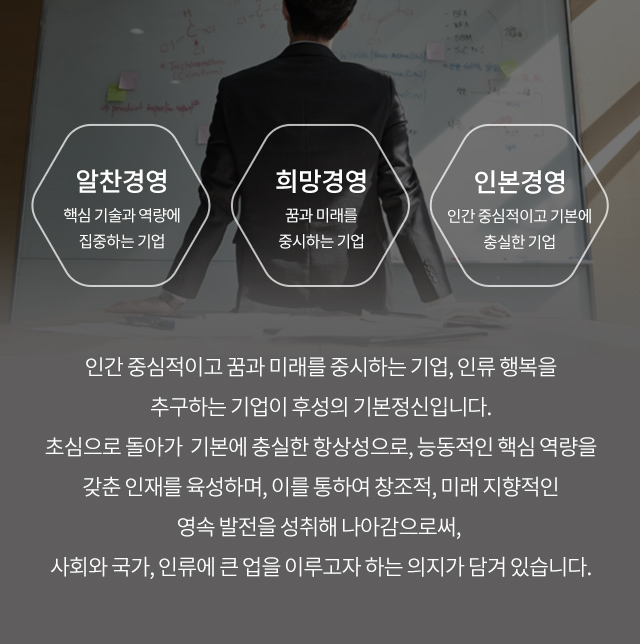 인본 경영과 신뢰를 바탕으로 후성인의 화합은 물론 고객과의 화합을 최우선으로 중시하고자 합니다