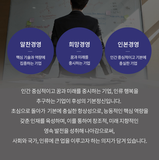 인본 경영과 신뢰를 바탕으로 후성인의 화합은 물론 고객과의 화합을 최우선으로 중시하고자 합니다